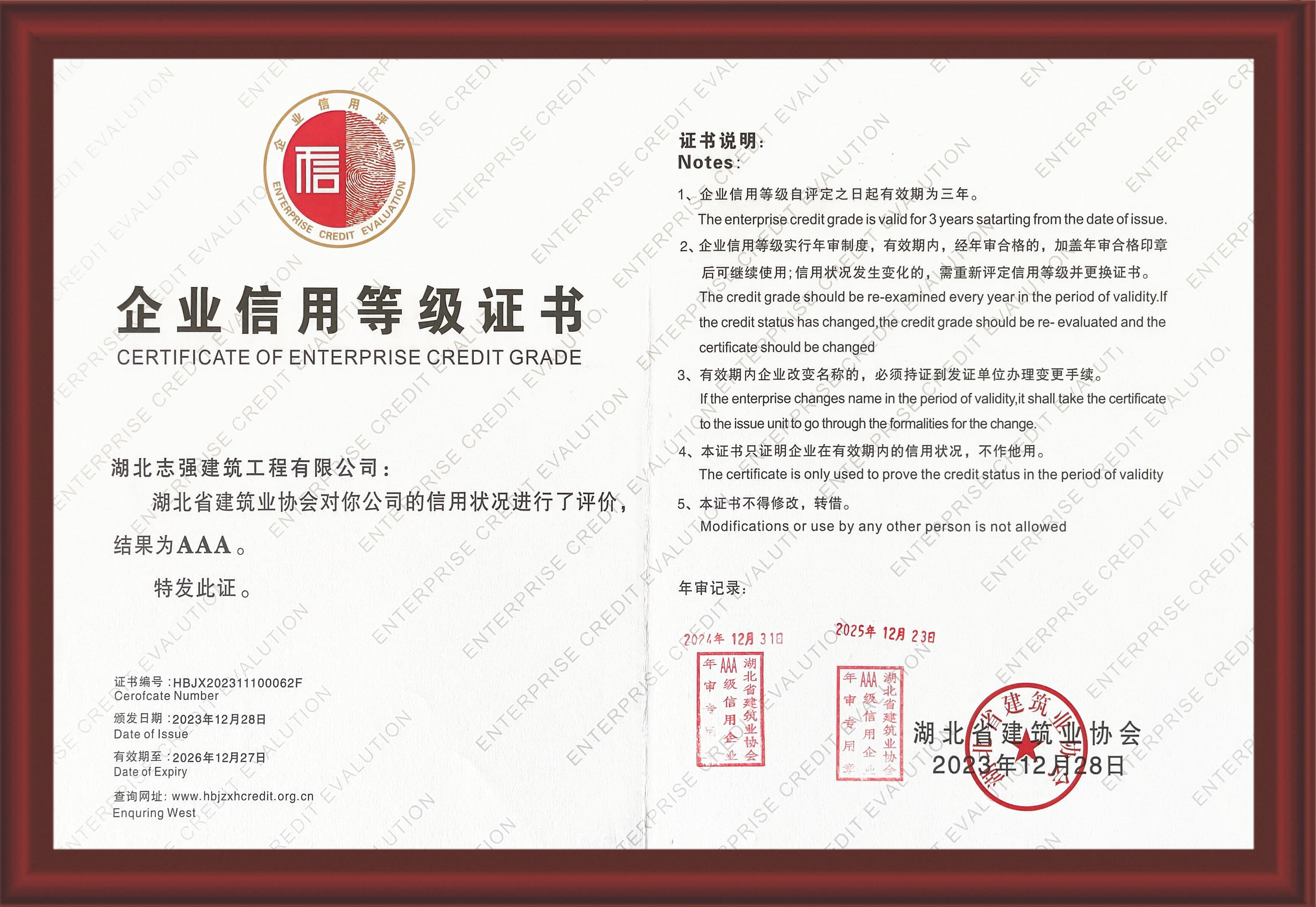 企业信用等级3A证书(湖北省建筑业协会)